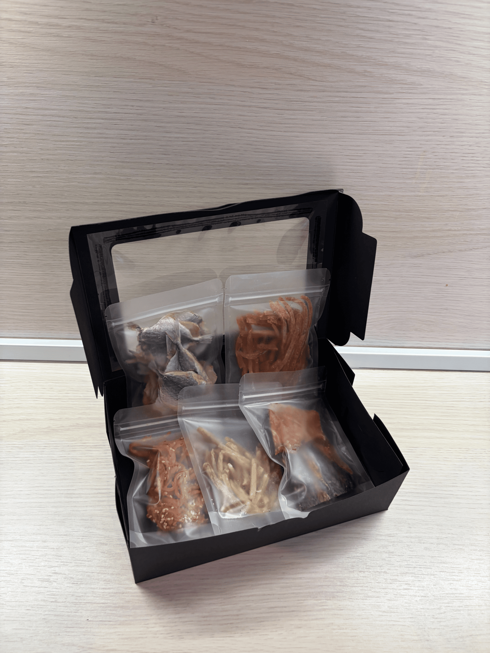 Ostrý rybí box je vytvorený pre milovníkov výraznejších a odvážnejších chutí. Kombinácia jemného tresčieho filé, sušeného tuniaka a pikantného amberjacka prináša príjemne hrejivú a podmanivú chuť, ktorá okamžite zaujme.
